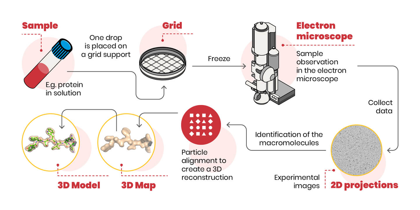 - secondly, electrons are particles with high energy and damage the molecules that they “light up”. All this has been overcome by the introduction of cryo-electron microscopy, in which the sample is cooled up to -173.15 °C: at this temperature water becomes glass-like, the molecules are immobilized and the damage caused by electrons is also reduced (discovery awarded with a Nobel Prize).