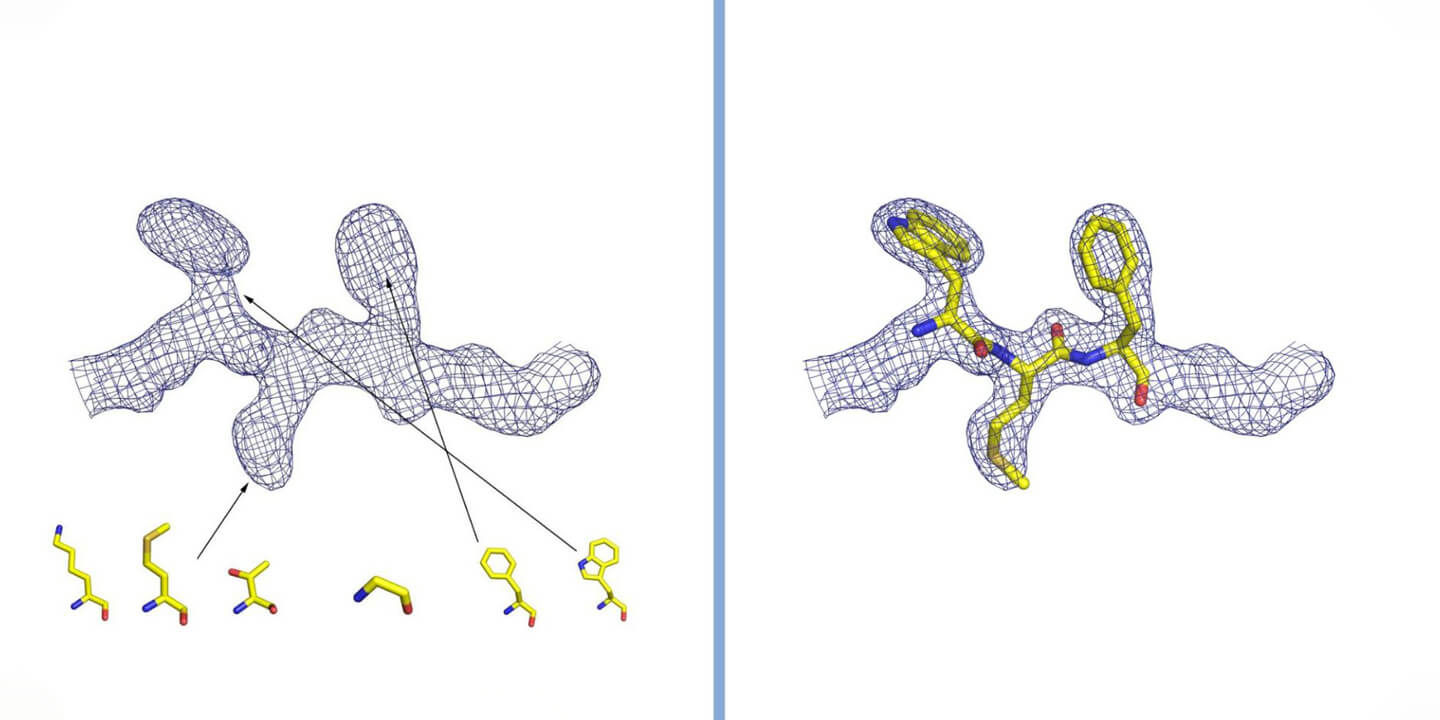 Interpretation of electron density in crystallography. The density is represented by a grid, inside which are the atoms that make up the protein. In the case of a protein, the shape of the density is observed and compared with the structure of the twenty amino acids that constitute it (some of which are represented in the figure). By inserting the amino acids in the correct order and following the three-dimensional winding of the electron density, the structure of the protein is reconstructed. Courtesy of Dr. Degano.